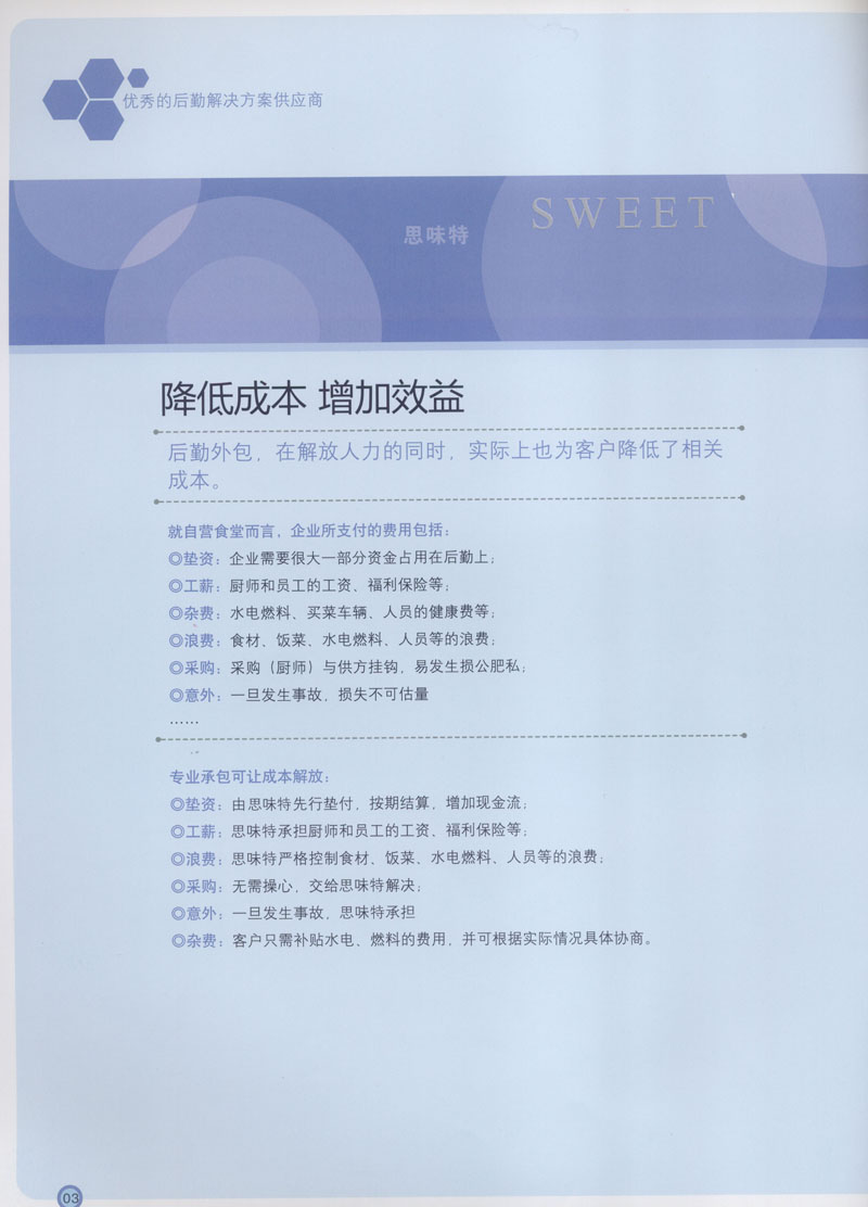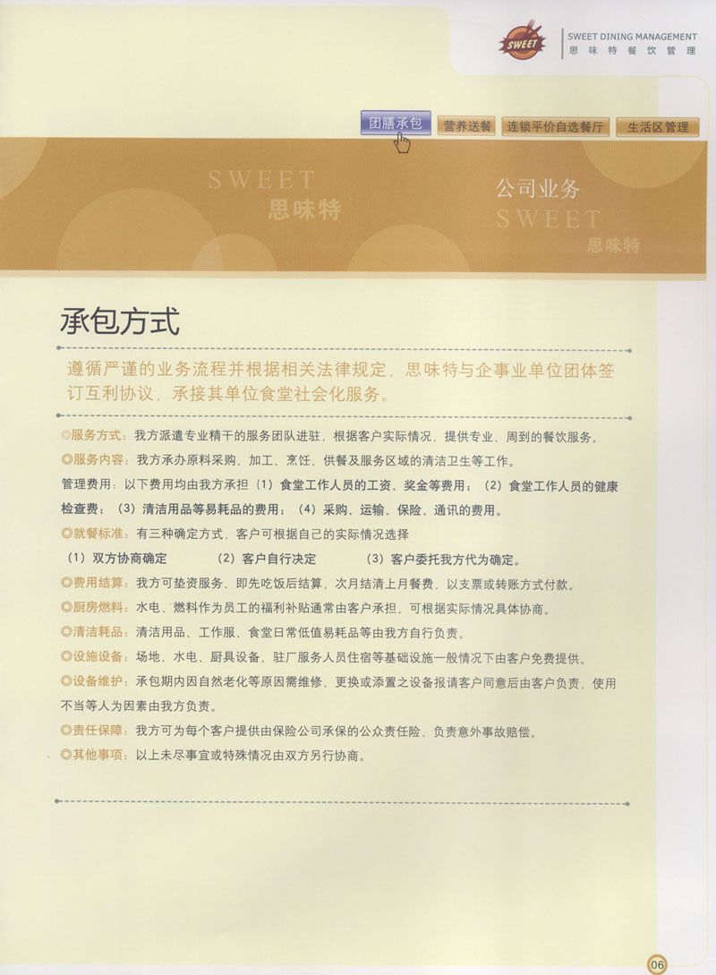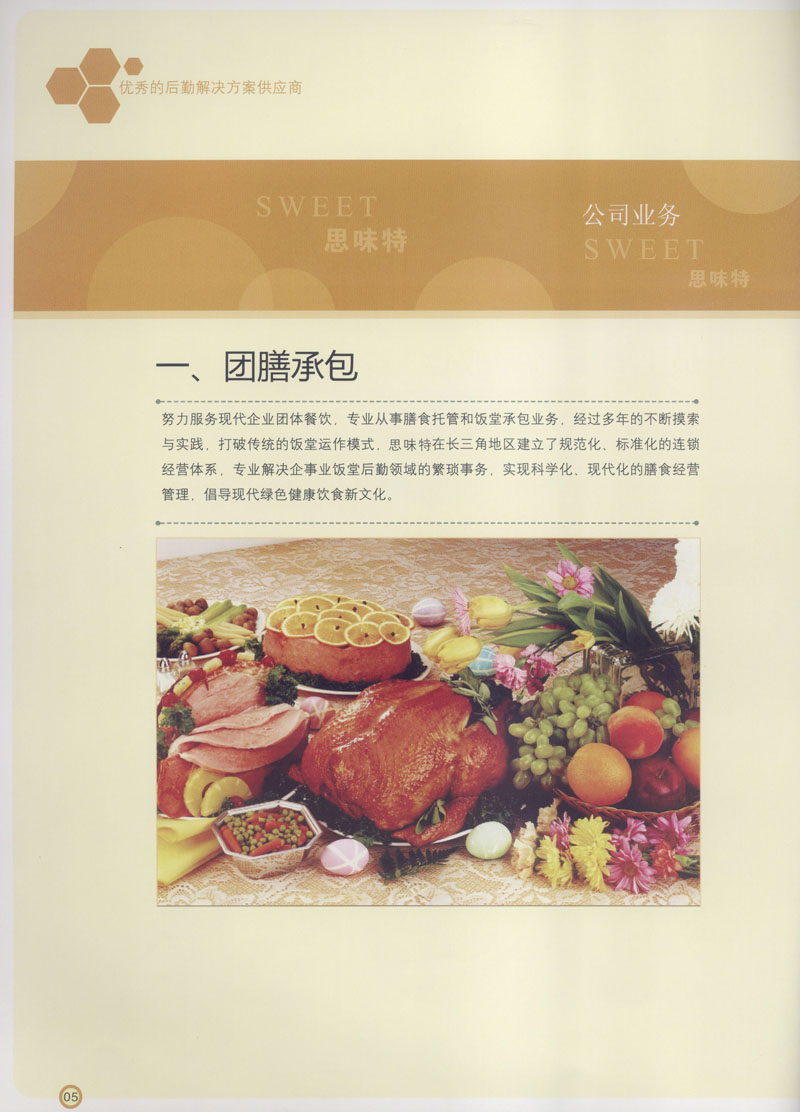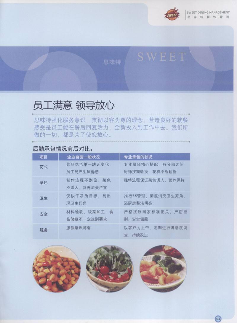 常州市思味特餐飲有限公司是一家專(zhuān)業(yè)從事企事業(yè)后勤服務(wù)的有限責(zé)任公司,公司從承包食堂起步,逐漸發(fā)展為經(jīng)營(yíng)團(tuán)膳承包、營(yíng)養(yǎng)送餐、生活區(qū)管理、連鎖餐廳的綜合型企業(yè)。2008年公司斥資100萬(wàn)元,在常州興建了可以同時(shí)提供3000餐膳食的中央廚房,重點(diǎn)打造“和美客”后勤服務(wù)品牌,全力為企事業(yè)單位解決后勤后顧之憂。 到目前為止,我們合作成功的企事業(yè)單位超過(guò)50多家,服務(wù)人數(shù)突破15萬(wàn),合作單位包括國(guó)家機(jī)關(guān)、國(guó)有企業(yè)、三資企業(yè)、民營(yíng)企業(yè)、學(xué)校、醫(yī)院等,其中不乏國(guó)際知名品牌公司。 和美客愿為更多的國(guó)內(nèi)外企事業(yè)單位及機(jī)關(guān)團(tuán)體分憂解難,從廚房設(shè)計(jì)、菜品配送、團(tuán)膳承包、到生活區(qū)管理等提供全方位的服務(wù)。