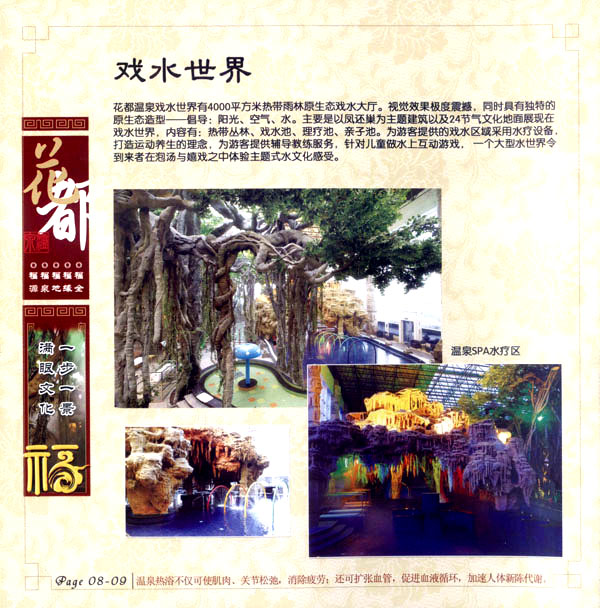 淹城花都溫泉水城孕育天地之精華,悅身、悅?cè)荨傂、悅神。置身其中泉水潺潺,霧氣繚繞、花瓣飄香,恍若仙境。“掬水月在手,弄花香滿衣”,花都溫泉的浪漫與溫潤(rùn)在這里完美展現(xiàn)。 花都溫泉水城包括洗浴區(qū)、戲水世界、露天溫泉、自助餐廳、生態(tài)房、別墅區(qū)、紅文化房、VIP區(qū)等多種功能區(qū)域,是集溫泉養(yǎng)生、休閑住宿、演藝會(huì)務(wù)為—體的休閑度假勝地,給賓客帶來江南小鎮(zhèn)的浪漫水城之旅。 古木新枝畔賓客對(duì)酒當(dāng)歌,溪泉石椅旁把茶品啜。 淹城-三勤生態(tài)酒店,這里是一處綠色生態(tài)的美食家園。此地鬼斧神工.奇水異石,和風(fēng)細(xì)雨林中穿過,引百鳥朝來暮歌;這里集生態(tài)餐飲、演藝、中小型會(huì)務(wù)為一體,將現(xiàn)代裝飾風(fēng)格和古雅拙樸的自然裝修完美整合;這里聚集大江南北名廚,推出精致綠色美昧佳肴。來到這里,賓客可享田園至美之景,品舌尖至鮮之味,實(shí)乃人生一大樂事。